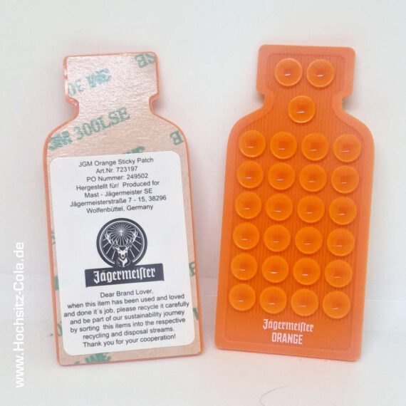 Es gibt so Artikel von Jägermeister, da muss ich erst einmal darüber nachdenken, für was die gedacht sind. Na? Erkennt Ihr das, was das sein soll? Diese Saugnapfmatte kann man hinten auf das Handy kleben, um das dann beispielsweise an einen Spiegel zu bappen…